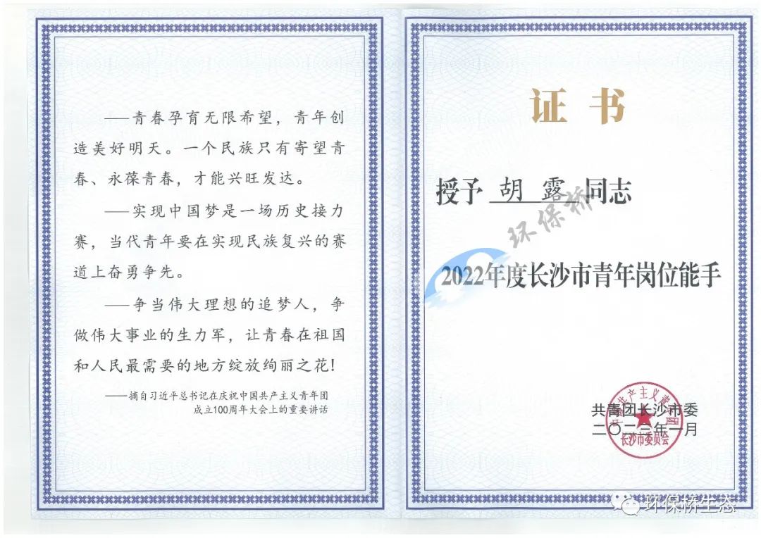 近日,經(jīng)逐級(jí)推薦、區(qū)縣初審、市級(jí)審核、人選培養(yǎng)和社會(huì)公示,共青團(tuán)長(zhǎng)沙市委確定了2022年度長(zhǎng)沙市青年崗位能手表彰名單,并進(jìn)行發(fā)文表彰。環(huán)保橋青年代表、技術(shù)總監(jiān)胡露榜上有名,成為獲此殊榮的全市生態(tài)環(huán)境領(lǐng)域唯一代表!
