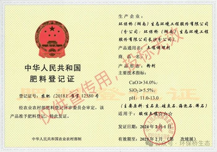 ?近日,從農(nóng)業(yè)農(nóng)村部肥料登記評審登記委員會傳來喜訊,環(huán)保橋土壤調(diào)理劑完成續(xù)展登記!新的肥料登記證的發(fā)證日期為2024年2月1日,有效期至2029年2月。登記證號不變,仍為農(nóng)肥(2018)準字12580號。