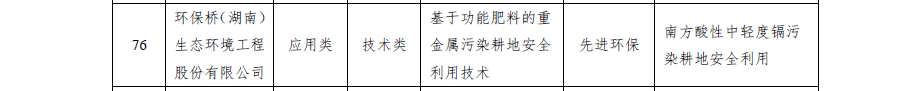 ?2024年12月24日,湖南省工業(yè)和信息化廳發(fā)布《關(guān)于公布湖南省工業(yè)領(lǐng)域鼓勵(lì)發(fā)展的綠色低碳先進(jìn)適用技術(shù)、裝備和產(chǎn)品目錄(2024年版)的通知》(湘工信節(jié)能〔2024〕481號(hào)),我司“基于功能肥料的重金屬污染耕地安全利用技術(shù)”成功入選,并成為耕地安全利用行業(yè)唯一入選技術(shù)!